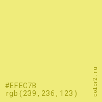 Цвет #EFEC7B в цветовой модели RGB обозначается тремя октетами (239, 236, 123) в десятичном формате и #EFEC7B в шестнадцатиричном (hex) формате, которые являются интенсивностью красного 239 (hex EF), интенсивность зелёного 236 (hex EC) и интенсивность синего 123 (hex 7B).