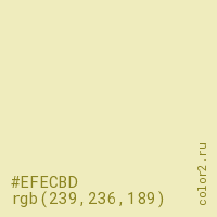 Цвет #EFECBD в цветовой модели RGB обозначается тремя октетами (239, 236, 189) в десятичном формате и #EFECBD в шестнадцатиричном (hex) формате, которые являются интенсивностью красного 239 (hex EF), интенсивность зелёного 236 (hex EC) и интенсивность синего 189 (hex BD).
