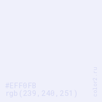 Цвет #EFF0FB в цветовой модели RGB обозначается тремя октетами (239, 240, 251) в десятичном формате и #EFF0FB в шестнадцатиричном (hex) формате, которые являются интенсивностью красного 239 (hex EF), интенсивность зелёного 240 (hex F0) и интенсивность синего 251 (hex FB).