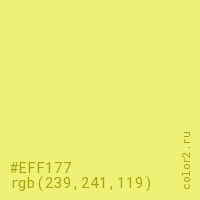 Цвет #EFF177 в цветовой модели RGB обозначается тремя октетами (239, 241, 119) в десятичном формате и #EFF177 в шестнадцатиричном (hex) формате, которые являются интенсивностью красного 239 (hex EF), интенсивность зелёного 241 (hex F1) и интенсивность синего 119 (hex 77).