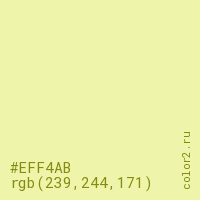 Цвет #EFF4AB в цветовой модели RGB обозначается тремя октетами (239, 244, 171) в десятичном формате и #EFF4AB в шестнадцатиричном (hex) формате, которые являются интенсивностью красного 239 (hex EF), интенсивность зелёного 244 (hex F4) и интенсивность синего 171 (hex AB).