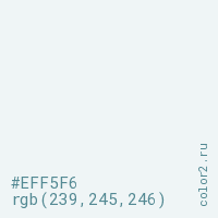 Цвет #EFF5F6 в цветовой модели RGB обозначается тремя октетами (239, 245, 246) в десятичном формате и #EFF5F6 в шестнадцатиричном (hex) формате, которые являются интенсивностью красного 239 (hex EF), интенсивность зелёного 245 (hex F5) и интенсивность синего 246 (hex F6).