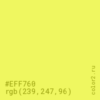 Цвет #EFF760 в цветовой модели RGB обозначается тремя октетами (239, 247, 96) в десятичном формате и #EFF760 в шестнадцатиричном (hex) формате, которые являются интенсивностью красного 239 (hex EF), интенсивность зелёного 247 (hex F7) и интенсивность синего 96 (hex 60).