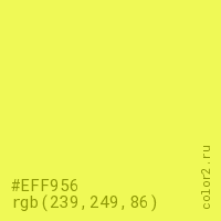 Цвет #EFF956 в цветовой модели RGB обозначается тремя октетами (239, 249, 86) в десятичном формате и #EFF956 в шестнадцатиричном (hex) формате, которые являются интенсивностью красного 239 (hex EF), интенсивность зелёного 249 (hex F9) и интенсивность синего 86 (hex 56).