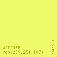 Цвет #EFFB6B в цветовой модели RGB обозначается тремя октетами (239, 251, 107) в десятичном формате и #EFFB6B в шестнадцатиричном (hex) формате, которые являются интенсивностью красного 239 (hex EF), интенсивность зелёного 251 (hex FB) и интенсивность синего 107 (hex 6B).