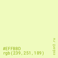 Цвет #EFFBBD в цветовой модели RGB обозначается тремя октетами (239, 251, 189) в десятичном формате и #EFFBBD в шестнадцатиричном (hex) формате, которые являются интенсивностью красного 239 (hex EF), интенсивность зелёного 251 (hex FB) и интенсивность синего 189 (hex BD).