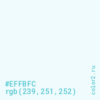 Цвет #EFFBFC в цветовой модели RGB обозначается тремя октетами (239, 251, 252) в десятичном формате и #EFFBFC в шестнадцатиричном (hex) формате, которые являются интенсивностью красного 239 (hex EF), интенсивность зелёного 251 (hex FB) и интенсивность синего 252 (hex FC).