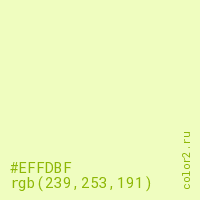 Цвет #EFFDBF в цветовой модели RGB обозначается тремя октетами (239, 253, 191) в десятичном формате и #EFFDBF в шестнадцатиричном (hex) формате, которые являются интенсивностью красного 239 (hex EF), интенсивность зелёного 253 (hex FD) и интенсивность синего 191 (hex BF).