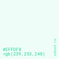 Цвет #EFFDF8 в цветовой модели RGB обозначается тремя октетами (239, 253, 248) в десятичном формате и #EFFDF8 в шестнадцатиричном (hex) формате, которые являются интенсивностью красного 239 (hex EF), интенсивность зелёного 253 (hex FD) и интенсивность синего 248 (hex F8).