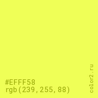 Цвет #EFFF58 в цветовой модели RGB обозначается тремя октетами (239, 255, 88) в десятичном формате и #EFFF58 в шестнадцатиричном (hex) формате, которые являются интенсивностью красного 239 (hex EF), интенсивность зелёного 255 (hex FF) и интенсивность синего 88 (hex 58).