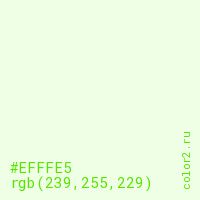 Цвет #EFFFE5 в цветовой модели RGB обозначается тремя октетами (239, 255, 229) в десятичном формате и #EFFFE5 в шестнадцатиричном (hex) формате, которые являются интенсивностью красного 239 (hex EF), интенсивность зелёного 255 (hex FF) и интенсивность синего 229 (hex E5).