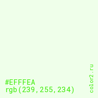 Цвет #EFFFEA в цветовой модели RGB обозначается тремя октетами (239, 255, 234) в десятичном формате и #EFFFEA в шестнадцатиричном (hex) формате, которые являются интенсивностью красного 239 (hex EF), интенсивность зелёного 255 (hex FF) и интенсивность синего 234 (hex EA).