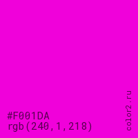 Цвет #F001DA в цветовой модели RGB обозначается тремя октетами (240, 1, 218) в десятичном формате и #F001DA в шестнадцатиричном (hex) формате, которые являются интенсивностью красного 240 (hex F0), интенсивность зелёного 1 (hex 01) и интенсивность синего 218 (hex DA).