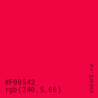 Цвет #F00542 в цветовой модели RGB обозначается тремя октетами (240, 5, 66) в десятичном формате и #F00542 в шестнадцатиричном (hex) формате, которые являются интенсивностью красного 240 (hex F0), интенсивность зелёного 5 (hex 05) и интенсивность синего 66 (hex 42).