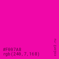 Цвет #F007A8 в цветовой модели RGB обозначается тремя октетами (240, 7, 168) в десятичном формате и #F007A8 в шестнадцатиричном (hex) формате, которые являются интенсивностью красного 240 (hex F0), интенсивность зелёного 7 (hex 07) и интенсивность синего 168 (hex A8).