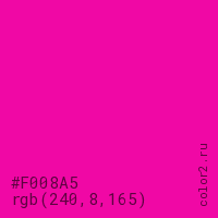 Цвет #F008A5 в цветовой модели RGB обозначается тремя октетами (240, 8, 165) в десятичном формате и #F008A5 в шестнадцатиричном (hex) формате, которые являются интенсивностью красного 240 (hex F0), интенсивность зелёного 8 (hex 08) и интенсивность синего 165 (hex A5).