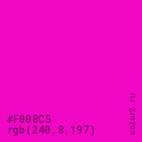 Цвет #F008C5 в цветовой модели RGB обозначается тремя октетами (240, 8, 197) в десятичном формате и #F008C5 в шестнадцатиричном (hex) формате, которые являются интенсивностью красного 240 (hex F0), интенсивность зелёного 8 (hex 08) и интенсивность синего 197 (hex C5).
