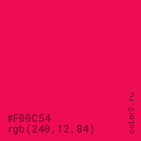 Цвет #F00C54 в цветовой модели RGB обозначается тремя октетами (240, 12, 84) в десятичном формате и #F00C54 в шестнадцатиричном (hex) формате, которые являются интенсивностью красного 240 (hex F0), интенсивность зелёного 12 (hex 0C) и интенсивность синего 84 (hex 54).