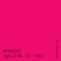 Цвет #F00C6C в цветовой модели RGB обозначается тремя октетами (240, 12, 108) в десятичном формате и #F00C6C в шестнадцатиричном (hex) формате, которые являются интенсивностью красного 240 (hex F0), интенсивность зелёного 12 (hex 0C) и интенсивность синего 108 (hex 6C).
