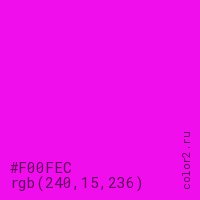 Цвет #F00FEC в цветовой модели RGB обозначается тремя октетами (240, 15, 236) в десятичном формате и #F00FEC в шестнадцатиричном (hex) формате, которые являются интенсивностью красного 240 (hex F0), интенсивность зелёного 15 (hex 0F) и интенсивность синего 236 (hex EC).