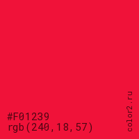 Цвет #F01239 в цветовой модели RGB обозначается тремя октетами (240, 18, 57) в десятичном формате и #F01239 в шестнадцатиричном (hex) формате, которые являются интенсивностью красного 240 (hex F0), интенсивность зелёного 18 (hex 12) и интенсивность синего 57 (hex 39).
