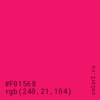 Цвет #F01568 в цветовой модели RGB обозначается тремя октетами (240, 21, 104) в десятичном формате и #F01568 в шестнадцатиричном (hex) формате, которые являются интенсивностью красного 240 (hex F0), интенсивность зелёного 21 (hex 15) и интенсивность синего 104 (hex 68).