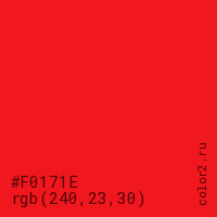 Цвет #F0171E в цветовой модели RGB обозначается тремя октетами (240, 23, 30) в десятичном формате и #F0171E в шестнадцатиричном (hex) формате, которые являются интенсивностью красного 240 (hex F0), интенсивность зелёного 23 (hex 17) и интенсивность синего 30 (hex 1E).