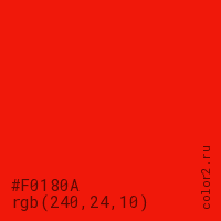 Цвет #F0180A в цветовой модели RGB обозначается тремя октетами (240, 24, 10) в десятичном формате и #F0180A в шестнадцатиричном (hex) формате, которые являются интенсивностью красного 240 (hex F0), интенсивность зелёного 24 (hex 18) и интенсивность синего 10 (hex 0A).