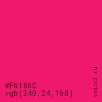 Цвет #F0186C в цветовой модели RGB обозначается тремя октетами (240, 24, 108) в десятичном формате и #F0186C в шестнадцатиричном (hex) формате, которые являются интенсивностью красного 240 (hex F0), интенсивность зелёного 24 (hex 18) и интенсивность синего 108 (hex 6C).