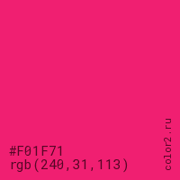 Цвет #F01F71 в цветовой модели RGB обозначается тремя октетами (240, 31, 113) в десятичном формате и #F01F71 в шестнадцатиричном (hex) формате, которые являются интенсивностью красного 240 (hex F0), интенсивность зелёного 31 (hex 1F) и интенсивность синего 113 (hex 71).