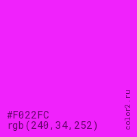 Цвет #F022FC в цветовой модели RGB обозначается тремя октетами (240, 34, 252) в десятичном формате и #F022FC в шестнадцатиричном (hex) формате, которые являются интенсивностью красного 240 (hex F0), интенсивность зелёного 34 (hex 22) и интенсивность синего 252 (hex FC).