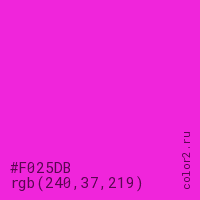 Цвет #F025DB в цветовой модели RGB обозначается тремя октетами (240, 37, 219) в десятичном формате и #F025DB в шестнадцатиричном (hex) формате, которые являются интенсивностью красного 240 (hex F0), интенсивность зелёного 37 (hex 25) и интенсивность синего 219 (hex DB).