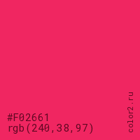 Цвет #F02661 в цветовой модели RGB обозначается тремя октетами (240, 38, 97) в десятичном формате и #F02661 в шестнадцатиричном (hex) формате, которые являются интенсивностью красного 240 (hex F0), интенсивность зелёного 38 (hex 26) и интенсивность синего 97 (hex 61).
