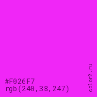 Цвет #F026F7 в цветовой модели RGB обозначается тремя октетами (240, 38, 247) в десятичном формате и #F026F7 в шестнадцатиричном (hex) формате, которые являются интенсивностью красного 240 (hex F0), интенсивность зелёного 38 (hex 26) и интенсивность синего 247 (hex F7).