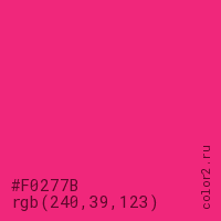 Цвет #F0277B в цветовой модели RGB обозначается тремя октетами (240, 39, 123) в десятичном формате и #F0277B в шестнадцатиричном (hex) формате, которые являются интенсивностью красного 240 (hex F0), интенсивность зелёного 39 (hex 27) и интенсивность синего 123 (hex 7B).