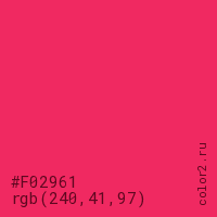 Цвет #F02961 в цветовой модели RGB обозначается тремя октетами (240, 41, 97) в десятичном формате и #F02961 в шестнадцатиричном (hex) формате, которые являются интенсивностью красного 240 (hex F0), интенсивность зелёного 41 (hex 29) и интенсивность синего 97 (hex 61).