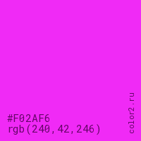 Цвет #F02AF6 в цветовой модели RGB обозначается тремя октетами (240, 42, 246) в десятичном формате и #F02AF6 в шестнадцатиричном (hex) формате, которые являются интенсивностью красного 240 (hex F0), интенсивность зелёного 42 (hex 2A) и интенсивность синего 246 (hex F6).