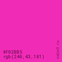 Цвет #F02BB5 в цветовой модели RGB обозначается тремя октетами (240, 43, 181) в десятичном формате и #F02BB5 в шестнадцатиричном (hex) формате, которые являются интенсивностью красного 240 (hex F0), интенсивность зелёного 43 (hex 2B) и интенсивность синего 181 (hex B5).