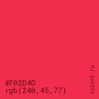 Цвет #F02D4D в цветовой модели RGB обозначается тремя октетами (240, 45, 77) в десятичном формате и #F02D4D в шестнадцатиричном (hex) формате, которые являются интенсивностью красного 240 (hex F0), интенсивность зелёного 45 (hex 2D) и интенсивность синего 77 (hex 4D).