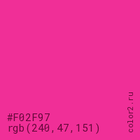 Цвет #F02F97 в цветовой модели RGB обозначается тремя октетами (240, 47, 151) в десятичном формате и #F02F97 в шестнадцатиричном (hex) формате, которые являются интенсивностью красного 240 (hex F0), интенсивность зелёного 47 (hex 2F) и интенсивность синего 151 (hex 97).
