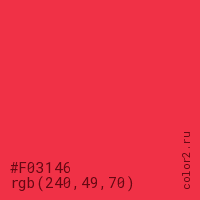 Цвет #F03146 в цветовой модели RGB обозначается тремя октетами (240, 49, 70) в десятичном формате и #F03146 в шестнадцатиричном (hex) формате, которые являются интенсивностью красного 240 (hex F0), интенсивность зелёного 49 (hex 31) и интенсивность синего 70 (hex 46).
