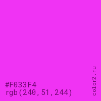 Цвет #F033F4 в цветовой модели RGB обозначается тремя октетами (240, 51, 244) в десятичном формате и #F033F4 в шестнадцатиричном (hex) формате, которые являются интенсивностью красного 240 (hex F0), интенсивность зелёного 51 (hex 33) и интенсивность синего 244 (hex F4).