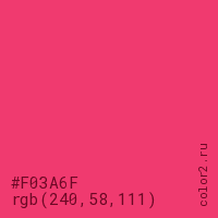 Цвет #F03A6F в цветовой модели RGB обозначается тремя октетами (240, 58, 111) в десятичном формате и #F03A6F в шестнадцатиричном (hex) формате, которые являются интенсивностью красного 240 (hex F0), интенсивность зелёного 58 (hex 3A) и интенсивность синего 111 (hex 6F).
