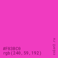 Цвет #F03BC0 в цветовой модели RGB обозначается тремя октетами (240, 59, 192) в десятичном формате и #F03BC0 в шестнадцатиричном (hex) формате, которые являются интенсивностью красного 240 (hex F0), интенсивность зелёного 59 (hex 3B) и интенсивность синего 192 (hex C0).