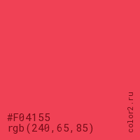 Цвет #F04155 в цветовой модели RGB обозначается тремя октетами (240, 65, 85) в десятичном формате и #F04155 в шестнадцатиричном (hex) формате, которые являются интенсивностью красного 240 (hex F0), интенсивность зелёного 65 (hex 41) и интенсивность синего 85 (hex 55).