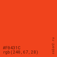 Цвет #F0431C в цветовой модели RGB обозначается тремя октетами (240, 67, 28) в десятичном формате и #F0431C в шестнадцатиричном (hex) формате, которые являются интенсивностью красного 240 (hex F0), интенсивность зелёного 67 (hex 43) и интенсивность синего 28 (hex 1C).
