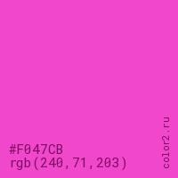 Цвет #F047CB в цветовой модели RGB обозначается тремя октетами (240, 71, 203) в десятичном формате и #F047CB в шестнадцатиричном (hex) формате, которые являются интенсивностью красного 240 (hex F0), интенсивность зелёного 71 (hex 47) и интенсивность синего 203 (hex CB).