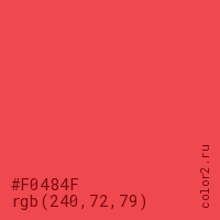 Цвет #F0484F в цветовой модели RGB обозначается тремя октетами (240, 72, 79) в десятичном формате и #F0484F в шестнадцатиричном (hex) формате, которые являются интенсивностью красного 240 (hex F0), интенсивность зелёного 72 (hex 48) и интенсивность синего 79 (hex 4F).