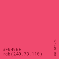Цвет #F0496E в цветовой модели RGB обозначается тремя октетами (240, 73, 110) в десятичном формате и #F0496E в шестнадцатиричном (hex) формате, которые являются интенсивностью красного 240 (hex F0), интенсивность зелёного 73 (hex 49) и интенсивность синего 110 (hex 6E).