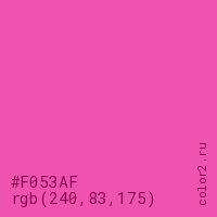 Цвет #F053AF в цветовой модели RGB обозначается тремя октетами (240, 83, 175) в десятичном формате и #F053AF в шестнадцатиричном (hex) формате, которые являются интенсивностью красного 240 (hex F0), интенсивность зелёного 83 (hex 53) и интенсивность синего 175 (hex AF).